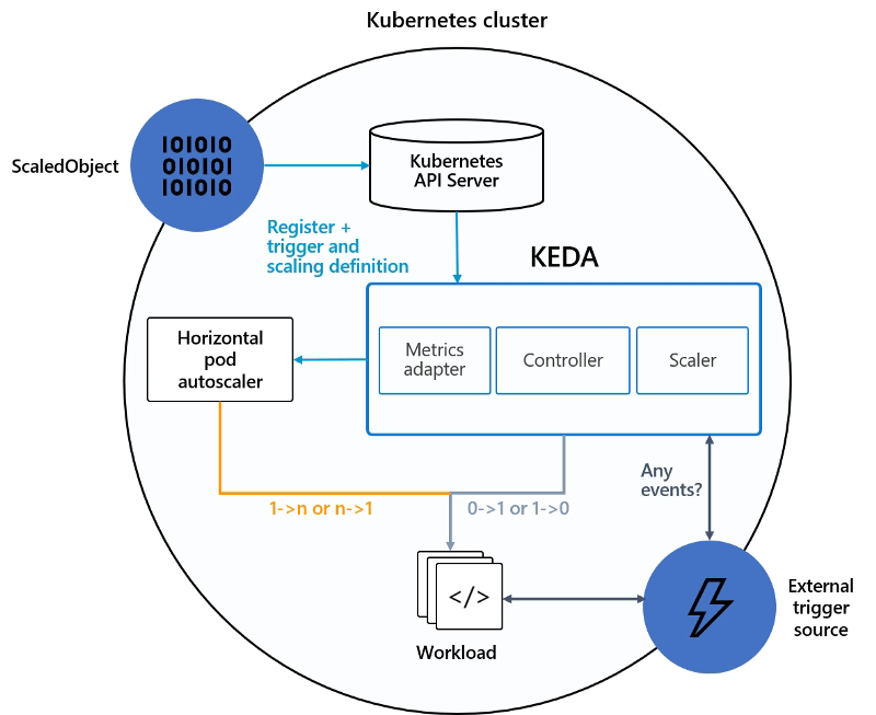 We have our ScaledObject that links our external event source (i.e., Apache Kafka, Prometheus ..) with the Kubernetes Deployment we would like to scale and register that in the Kubernetes cluster.