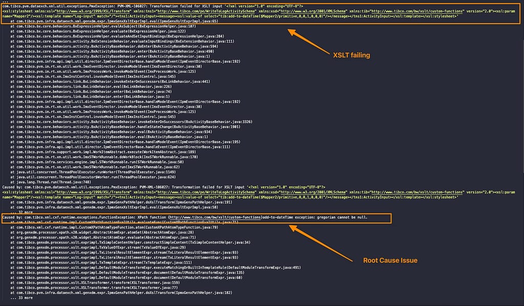 com.tibco.pvm.dataexch.xml.util.exceptions.PmxException: PVM-XML-106027: Transformation failed for XSLT input '<?xml version="1.0" encoding="UTF-8"?>