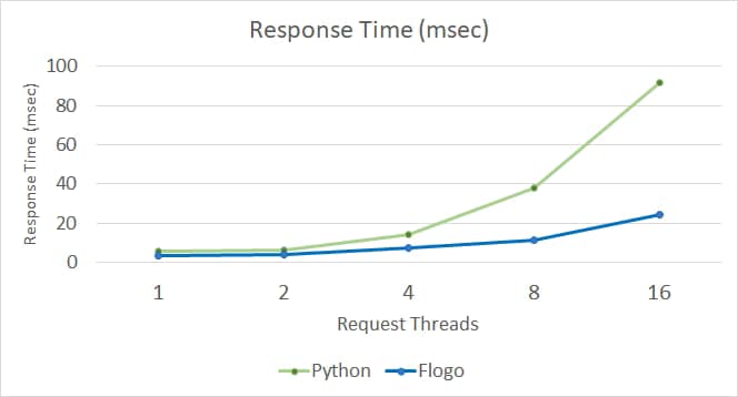 As we can see first of all the response time is always smaller from the Flogo API (and remember that this is a default test, with no special tuning or something similar) and also the response time is performing better in Flogo being able to keep stable almost until 4 threads and then being able to control the increase while Python REST service after 2 threads the response time increase more than twice with each test.