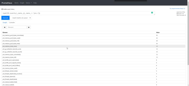 And now we have all the power at my hands. For example, let’s take a look not at the 10 more relevant but the 100 more relevants or any other filter that we need to apply. For example, let’s see the metrics regarding with the JVM that we discussed at the beginning. And we will do that with the following PromQL query:
