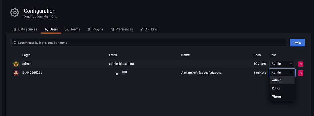 And then you can search for a User and you will see how this user will play on the Grafana Server: