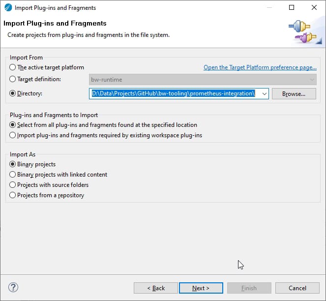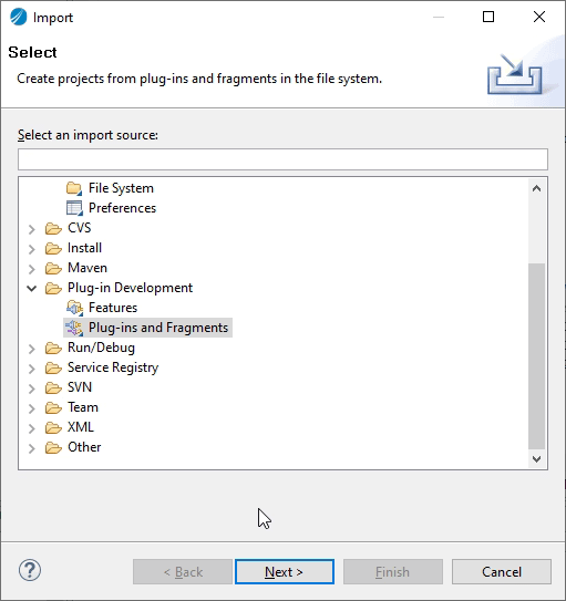 - Right-click in Project Explorer → Import… → select Plug-ins and Fragments → select Import from the directory radio button