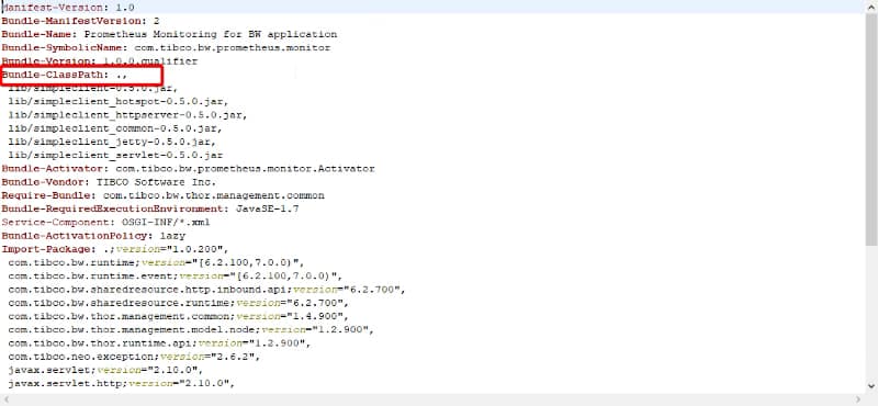- Now, to create JAR of this plugin so first, we need to make sure to update com.tibco.bw.prometheus.monitor with ‘.’ (dot) in Bundle-Classpath field as given below in META-INF/MANIFEST.MF file.
